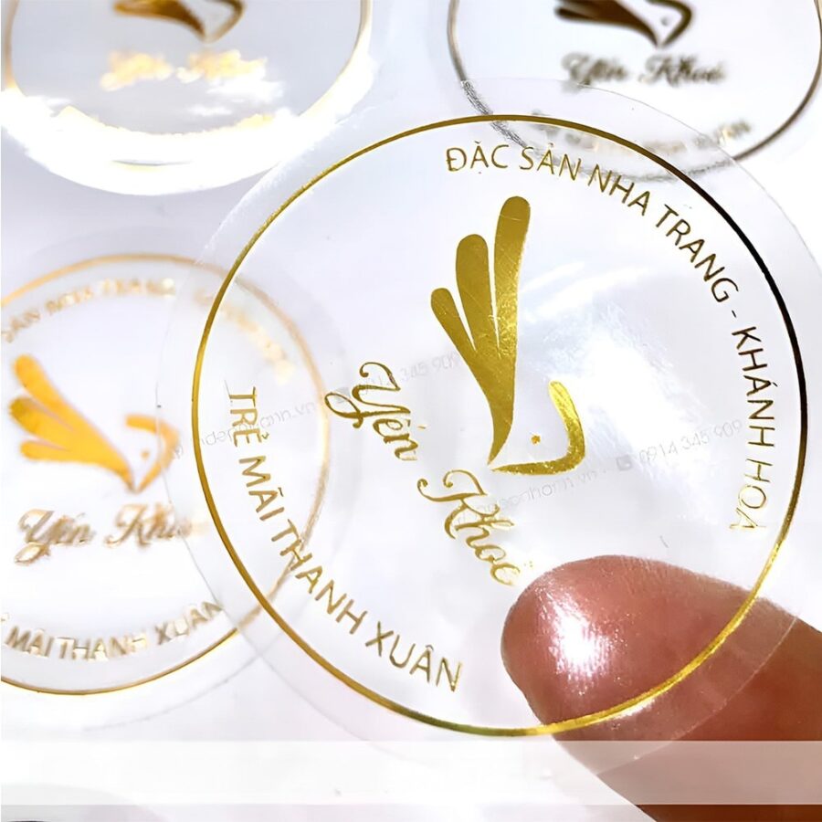 - Độ trong suốt cao: Tem nhãn decal trong có độ trong suốt cao, giúp người nhìn có thể nhìn xuyên qua tem nhãn để thấy được sản phẩm bên dưới. Điều này giúp cho tem nhãn decal trong phù hợp với các sản phẩm được đựng trong các bao bì trong suốt, chẳng hạn như chai thủy tinh, bình nhựa, cửa kính,…