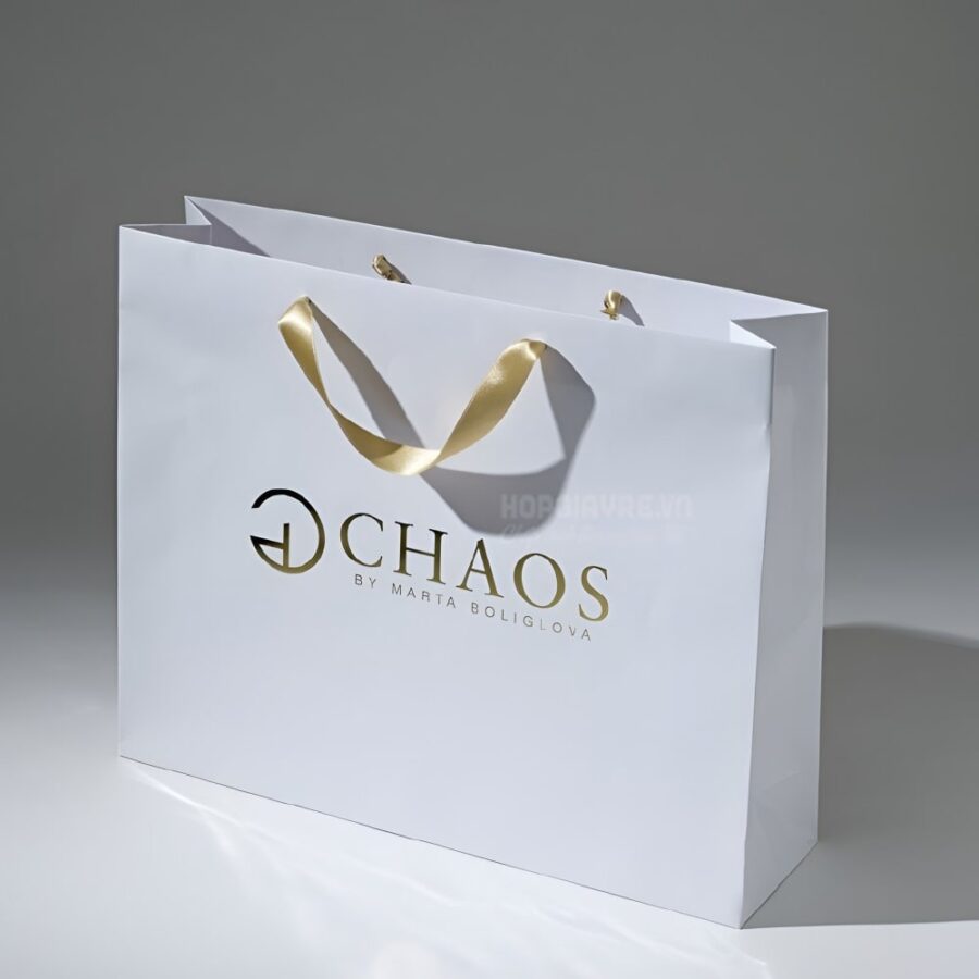 Chất liệu giấy: Túi giấy cho shop thời trang thường được in từ các chất liệu giấy bền, chắc, có khả năng chịu lực tốt như giấy Kraft, giấy Duplex, giấy Couches,…